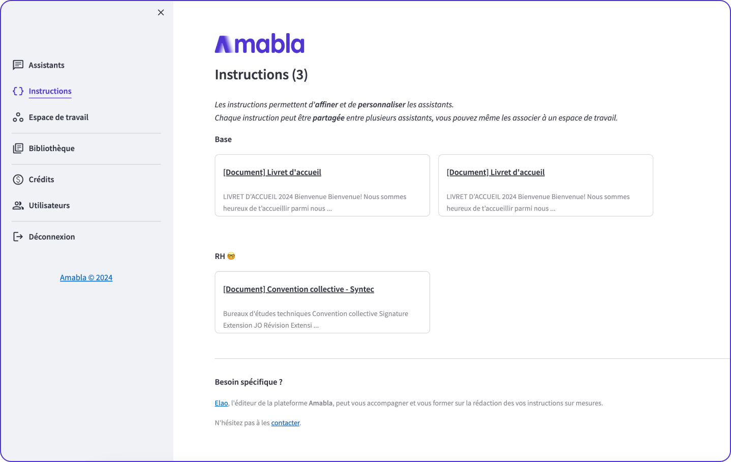 Amabla vous permet de partager et d’utiliser vos assistants dans le contexte le plus adapté pour vos collaborateurs, vos utilisateurs ou vos clients. Vous avez le contrôle sur la manière dont chaque assistant est utilisé et diffusé.
